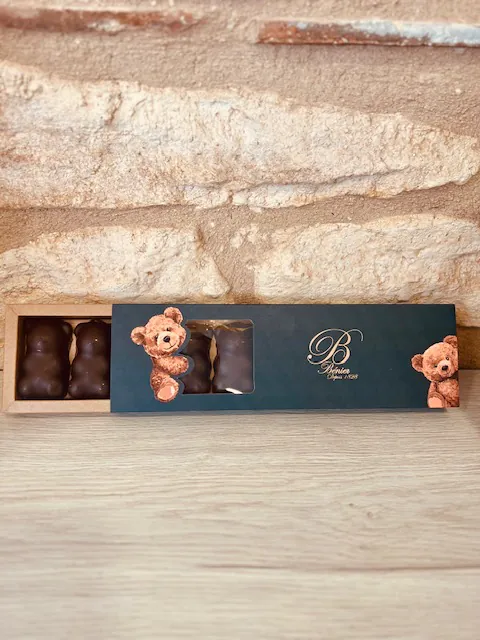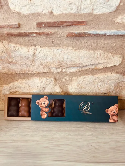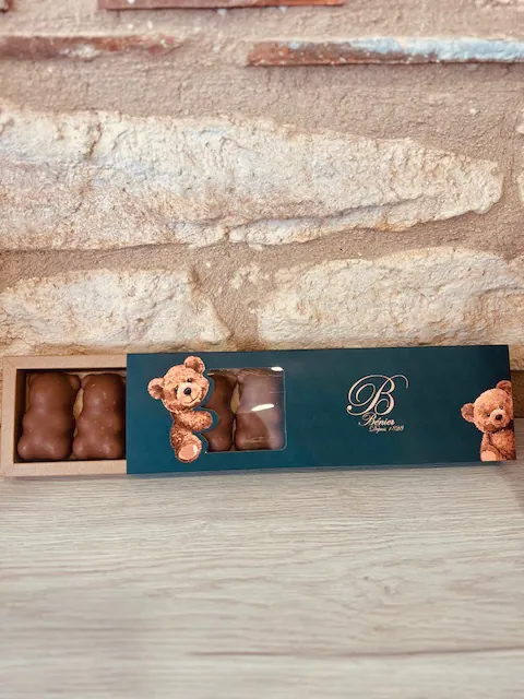 Ce coffret est garni de 7 oursons en guimauve tendres et délicats qui vont enchanter les petits et les grands gourmands au fil des générations. C’est un doux souvenirs d’enfance que celui de croquer à pleine dents dans un ourson guimauve enrobé de chocolat noir ou au lait…..